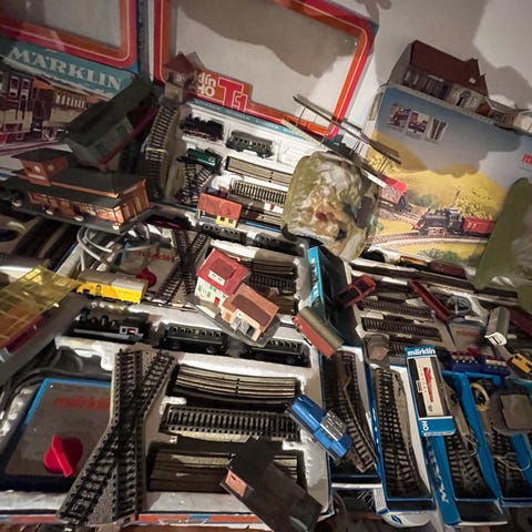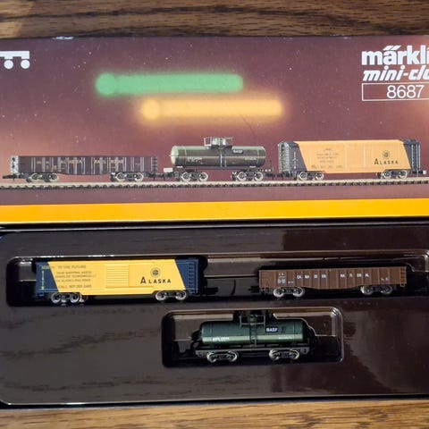 Märklin H0 modelljärnväg startset med lok, godsvagnar, rälsdelar och styrning. Setet innehåller kurv- och rakspår, växlar samt transformator/reglage för körning. Flera originalkartonger och manualer/planritningar ingår. Passar för uppbyggnad av komplett H0-bana med godståg och utbyggnad med extra spår och växlar enligt medföljande spårplaner.