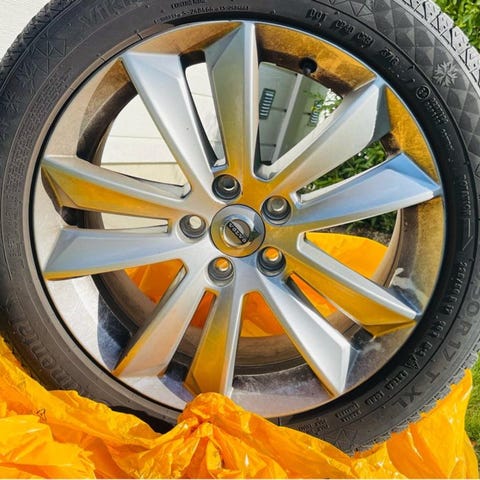 Fälgarna satt på bilen vid köp hos Volvo och byttes direkt på verkstad. De är i mycket fint skick, endast en mindre repa på en fälg (syns på bild). Bromsdamm förekommer.