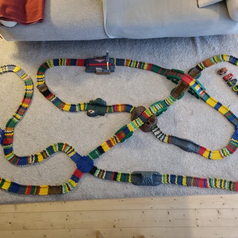 Stort sammling av flexitrax och liknade banor. Olika delar så ingen set. Massor av vägbitar det måsta vara mer än 15m. Två bilar (saknar batterier).