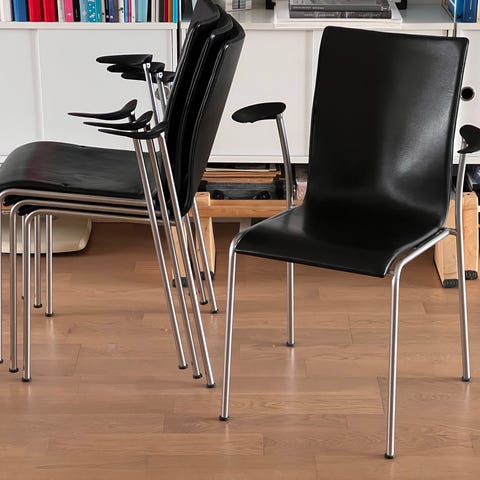 4 stolar i nyskick. stolar med stoppade och klädda sitsar i mörkgrått, i nyskick, med justerbara fötter. Rygg och armstöd i ljus bok och underrede i krom. Stapelbara.