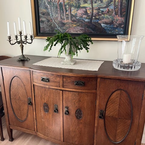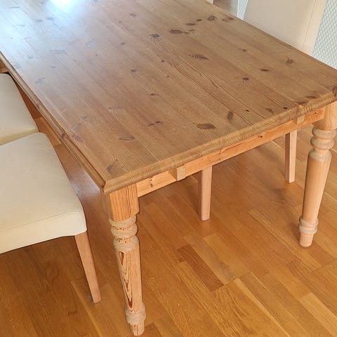 Massivt matbord med 2 klaffar och 6 stolar med blått skinn. Stolarna sittunderlag är i skinn så de är mjuka att sitta på.