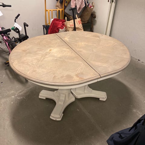 Vi köpte matgruppen på antikvariat 2024 för 600kr och det har tjänat oss mycket väl, framförallt till middagsbjudningar då det går att klämma ihop sig 8 personer. Inte så snygga kanter med iläggsskivan men funkar utmärkt med en duk då den är helt stabil och mkt lätt att sätta i.