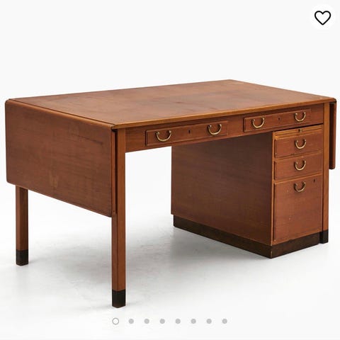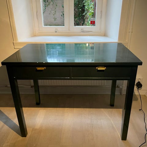 Skrivbord som inköptes på auktion 2022. Därefter har det målats (lådornas front och skivan) och skivan behöver en ny omgång färg, i övrig i fint skick. Färgkod finns.