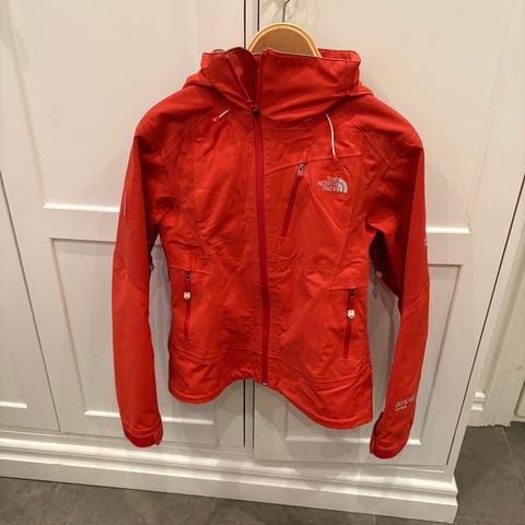 Haglöfs jacka för dam i storlek XS. Jackan är röd och tillverkad i polyamid med goretex. Modellen har huva, hel dragkedja framtill och flera fickor med dragkedja på bröst och sidor. Insidan har meshpaneler för ventilation.
