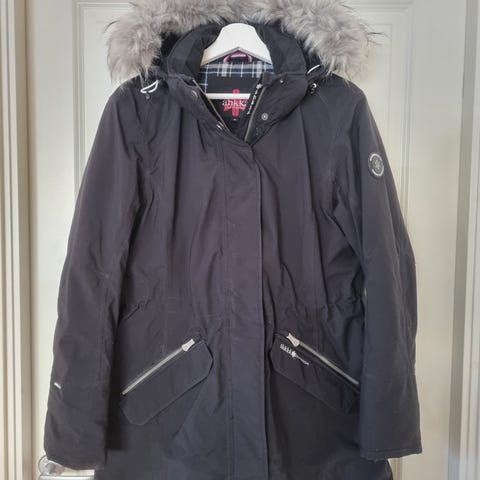 Svart vinterparkas med fuskpäls på luvan. Parkasen har en dragkedja framtill och knappar. Det finns flera fickor och en justerbar midja för en bekväm passform. Insidan är fodrad för extra värme.