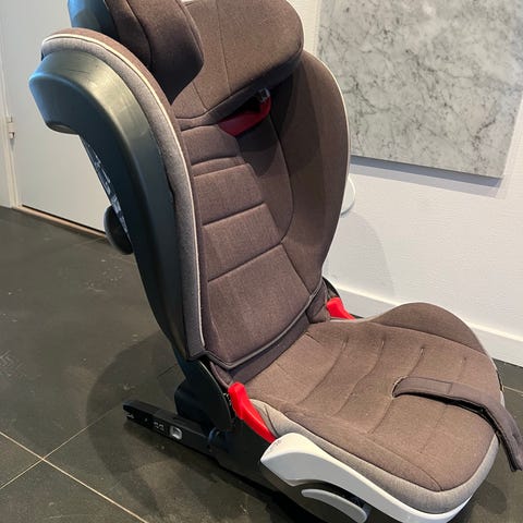 Isofix-fästen. Bältesfäste vid både axel samt mellan benen på barnet för att förhindra att barnet kan glida ner under bältet, utan förbli en upprest position.