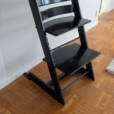 Svart tripp-trapp-stol. Bygel finns också (ej med på bild). Använd men bra skick! Hämtas i Simlångsdalen, Smålanstenar eller Halmstad.