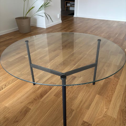 Modernt runt soffbord med skiva i härdat glas & underrede i metall. Ett trendigt designval för ditt hem.