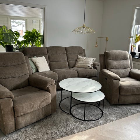 Mycket skön tvåsitssoffa som har el- liggläge på båda platserna. Mellanbord med förvaring, två mugghållare samt USB-uttag för laddning. Soffan är köpt på Mio för 3 år sedan. Nypris: 11 046:-