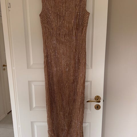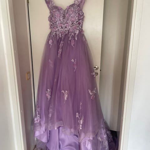Klänningen passar en tjej som är en xs/s. Den är uppsydd efter min dotter och hon är 1,62 och väger ca. 58 kg.