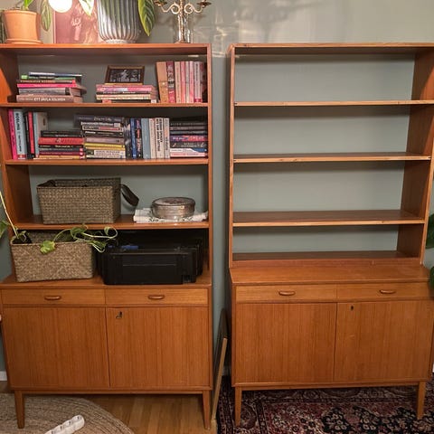 Retro bokhylla teak med tidningsställ. 50-60 tal? Kan användas delad som två separata bokhyllor.