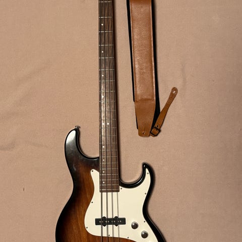 En 4-strängad röd elbas i vuxenstorlek. Den har några små skador men man märker dem inte och de ändrar inte ljudet på något sätt. Perfekt för nybörjare.