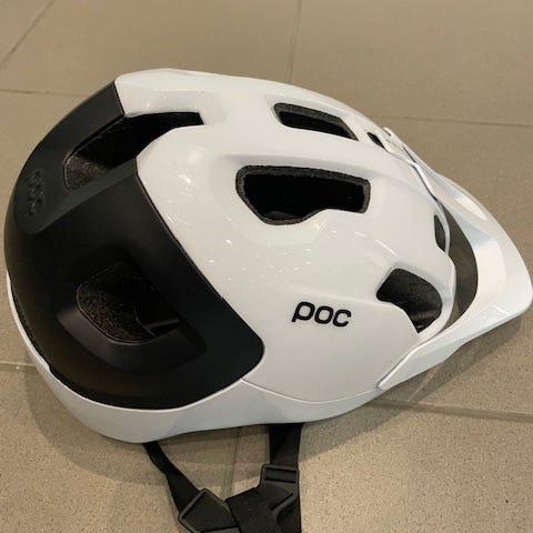 Hjälmen är i gott skick och endast använd ett fåtal gånger. Inga sprickor, skador eller slitage — ser i princip ny ut.