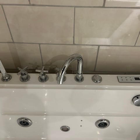 Vitt bubbelbadkar / jacuzzi med inbyggda massagejets längs sidor och ryggdel. Badkaret har flera kromade munstycken och reglage för att styra vattenflöde och luft. Blandare och handdusch får du på köpet! Passar för installation i badrum där man önskar badkar med massagefunktion och flera inställningsmöjligheter. Hämtas i Svärtinge!