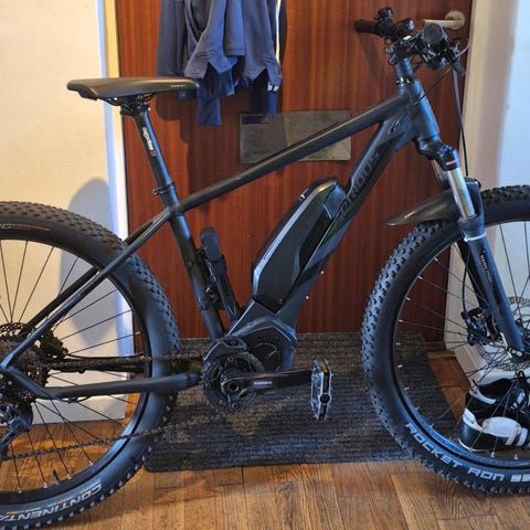 Använd under en säsong. Alltid stått förvarad inomhus och batteri i toppskick. Ingår två stora väskor speciellt anpassat för cykeln. Passar längd mellan 160-185