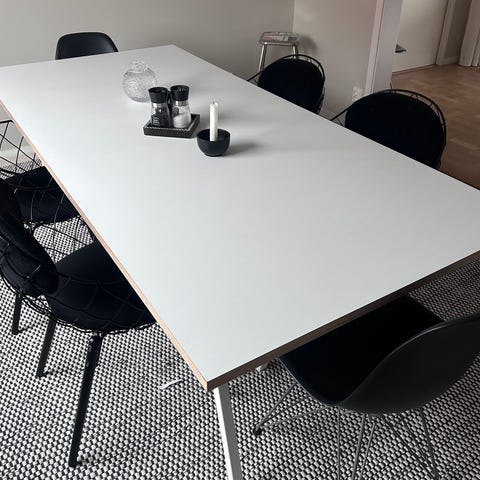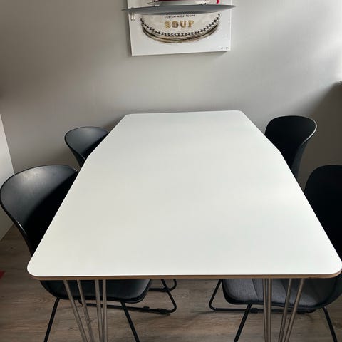Säljer en vit matgrupp med 4 stolar. Överlag bra skick, finns lite småmärken men inget man tänker på. Stolarna har möbeltassar för att skydda golven.