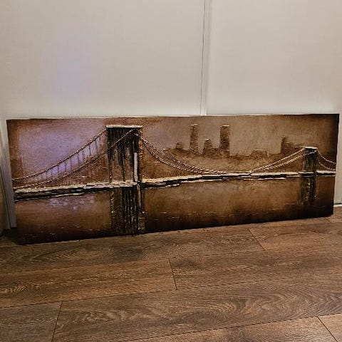 Tavla med skogsmotiv föreställande trädstammar mot en mörk bakgrund. Träden är utåtstående som en skulptur. Färgskalan går i dova, mörka toner med inslag av metallisk lyster i träden. Passar som väggdekoration i exempelvis vardagsrum, hall eller sovrum.