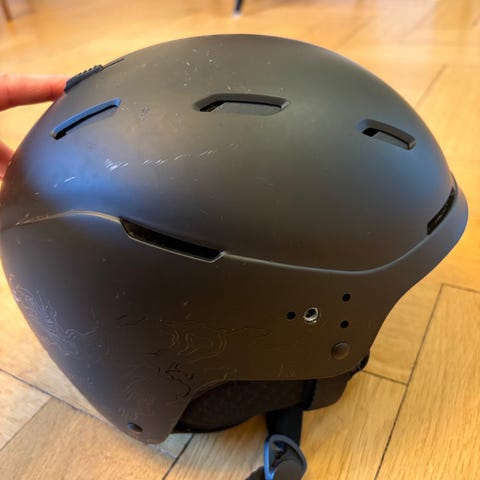 skid- och snowboardhjälm i storlek S/M (52–54 cm) i svart färg. Hjälmen har justerbart storlekssystem (Mios) ventilationsöppningar upptill och på sidorna samt öronlappar med fäste för hakrem.