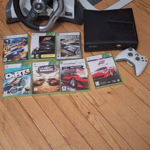 Microsoft Xbox spelkonsol i svart färg. Paketet inkluderar en spelratt med gula detaljer och tillhörande pedalset, samt handkontroll och kablar som syns på bilderna. Några Xbox-spel på skivor ingår också enligt bilderna. Konsolen är avsedd för TV-anslutning och används för spel med handkontroll eller ratt och pedaler, exempelvis bilspel.