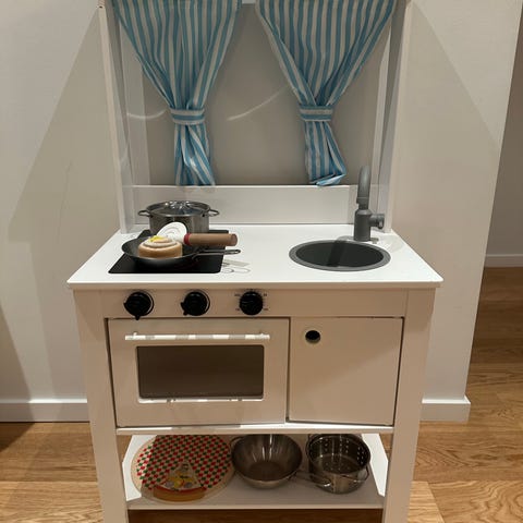 IKEA leksakskök i vitt utförande. Köket har spisplatta, ugn med lucka, diskho med kran och förvaringsutrymme. På bilderna syns även tillbehör som kastrull och leksaksmat. Passar för rollekar i barnrum eller lekhörna. Mindre märken och bruksspår kan förekomma, se bilder för detaljerad skickbedömning.