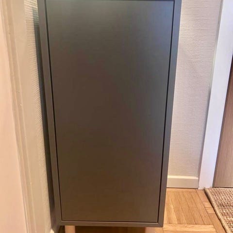 Två hyllplan i varje skåp. Dörrarna stängs med tryckfunktion och magnet. Smart och bra skåp/förvaring i mindre utrymmen. Går att kombinera med andra delar i Ikea Eket serien.