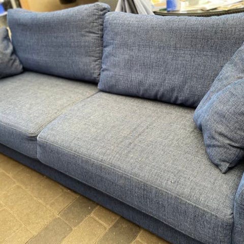 3 sits bäddsoffa med blått tyg och ben i ek. Mycket sparsamt använd. Inköpt på Mio 2019 för nypris 9995:-. Katt finns i hemmet
