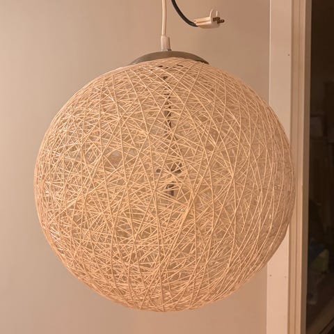 Brun korg, flätad som ett nystan. Sprider ljuset fint. 50 cm i diameter, ca 45 cm hög.