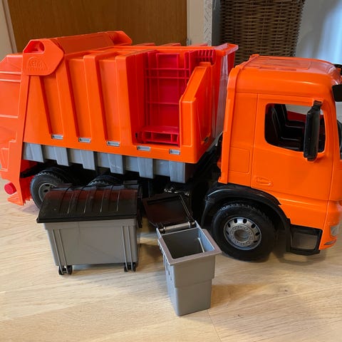 Bruder lastbil med gul hytt och flak samt röd kran. Lastbilen har flera detaljer som stödben, rörliga delar och sex hjul. Till lastbilen ingår olika last- och byggtillbehör; 10 pallar, 2 lådor och en liten lastbur. Kranen har en koppling längst ut, på vilken man kan sätta de medföljande tillbehören; krok, gaffel eller grävskopa.