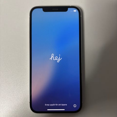 Apple iPhone 12 smartphone med 64 GB lagringsutrymme i vit färg. Modellen har dubbla bakre kameror, Face ID och en skärm med helskärmsdesign. Enheten lämpar sig för vardaglig användning som samtal, meddelanden, surf, appar och media. Batteriinformation och övriga tekniska detaljer framgår i telefonens inställningar och på förpackningen.