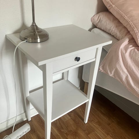 Vitt nattduksbord med en låda och en hylla