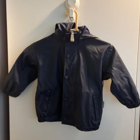 OBS! St 130-140 lager 157. Fodrad regnjacka mycket bra skick men en knapp till luvan där fram har försvunnit.