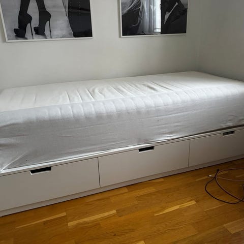 Säljer IKEAs klassiker NORDLI sängstomme 90 cm bred. Perfekt för ett mindre rum med plats för täcken eller kläder i tre rymliga lådor. Säljes utan madrass.