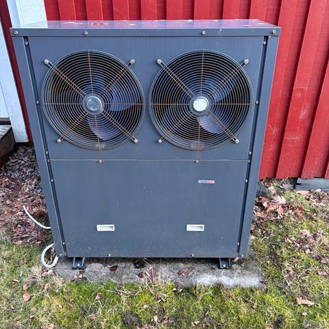 Värmepump utomhusdel i grått utförande. Enheten är avsedd för placering utomhus och anslutning till befintligt värmesystem. Hölje i metall med gallerförsedd fläkt på ena sidan och anslutningar på baksidan. Passar för uppvärmning av bostad eller annan lokal där värmepumpssystem används. Exakt effekt, modellbeteckning och fabrikat framgår inte av bilderna och behöver kontrolleras på plats eller via märkplåt på enheten.