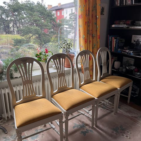 Fyra stolar i bokträ med visst renoveringsbehov. Samtliga ryggar behöver limmas, annars gott skick. Dynor och textilier i gott skick.