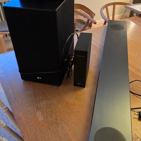 LG soundbar med tillhörande subwoofer och två bakhögtalare. Systemet består av en lång soundbar för placering vid TV:n, en fristående trådlös subwoofer samt två separata trådlösa bakhögtalare för surroundljud. Passar för användning tillsammans med TV i vardagsrum eller liknande miljö för att förbättra ljudupplevelsen vid film, serier och musikuppspelning.