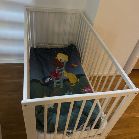 Spjälsäng från IKEA med ny madrass. Sängen har lite färgskav (se exempel på bild) och tecken på användning men inget som påverkar funktion. Madrassen i princip ny, barnet har sovit någon enstaka natt i sängen.