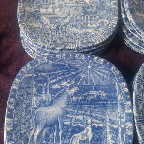 Rörstrand tallrik med blå dekor Fyrkantigt rundad form med mönster runt kanten och detaljerad natur- och djurscen i mitten. Tallriken är lämplig som samlarobjekt, prydnad eller serveringsfat. 14 st tallrikar