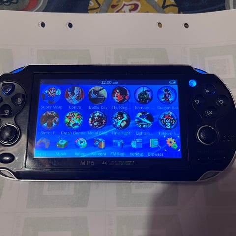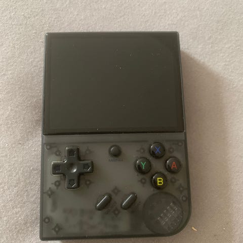 Handhållen retro spelkonsol i svart färg. Enheten har inbyggd skärm på framsidan samt styrkors och knappar för spelkontroll. På baksidan finns batterilucka och informationstext med CE-märkning. Konsolen är avsedd för bärbart spelande och drivs med batteri som placeras bakom luckan på baksidan. Passar för användare som vill spela enklare retroinspirerade spel i ett kompakt format. Innehåller vanligtvis 240 inbyggda spel.