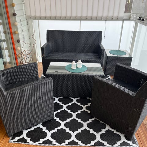 Trädgårdsgrupp bestående av hörnsoffa, rektangulärt bord. Soffan är placerad i vinkel med flera ryggkuddar och sittdynor i grå toner. Bordet har rektangulär bordsskiva och ben i samma stil som soffan och fåtöljen. Gruppen är avsedd för utomhusbruk, exempelvis på altan eller uteplats, och ger sittplatser för flera personer runt bordet.