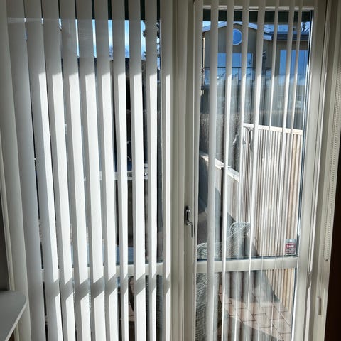 Vita vertikala lamellgardiner till fönster och altandörr