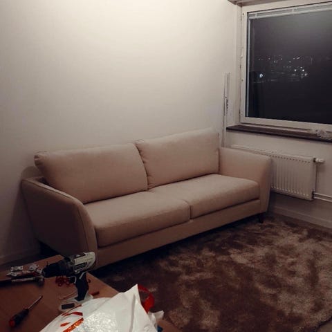 Soffan är köpt och levererad i slutet av 2021. Soffa har använts under 2022 och hälften av 2023, och sedan dess har den stått i princip oanvänt i vårt gästrum sedan vi flyttade till en större lägenhet.