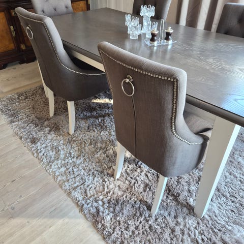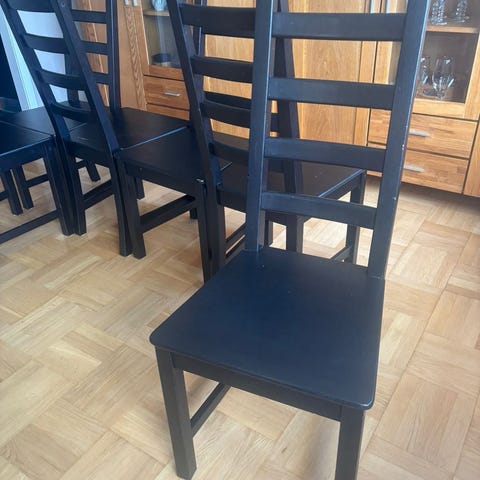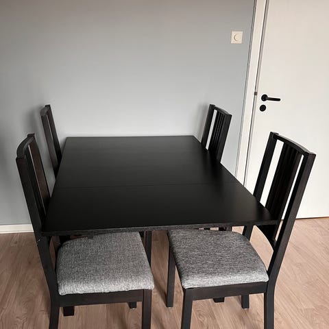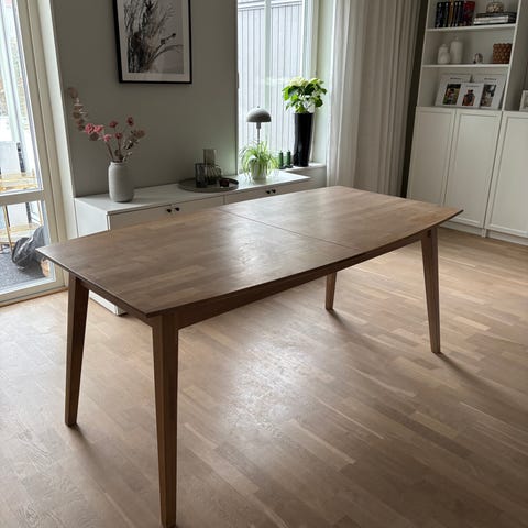 Jag säljer ett bord med sex stolar från Mio. Bordet är 180x90 cm och kan förlängas till 260 cm. Jag har två brädor (inte vita) som tillhör bordet som enkelt kan placeras vid behov av förlängning. Bordet och stolarna är tillverkade av ek, ursprungligen ekfärgade, och har målats (sprutat) om vita, även lackad.