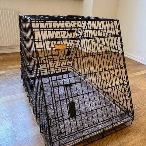 Hundbur i svart metall med plastbotten. Burens form är anpassad för placering mot vägg eller i bagageutrymme. Passar för transport eller som viloplats för hund. Metallgallret ger god ventilation och överblick för djuret, medan botten är lätt att ta ur och rengöra.