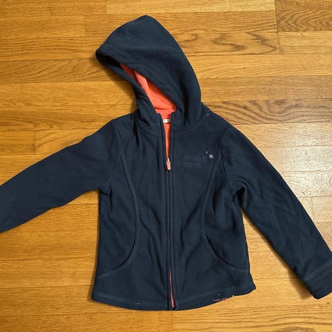Lila fleecejacka med rosa detaljer. Jackan har en huva och dragkedja. Perfekt för kyligare dagar!