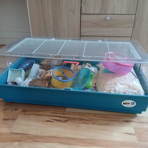 Rymlig bur med allt man behöver då vår lilla bamse gått bort.