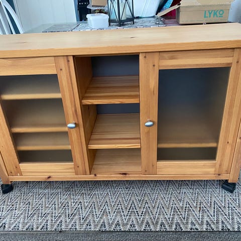 Säljer ett stabilt och charmigt träskåp i vintagestil med vackra glasluckor med dekorativ spröjs. Skåpet är i massivt trä och känns gediget och välbyggt.