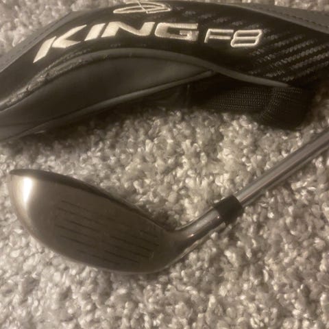 Cobra King F8 hybridklubba i svart utförande. Klubban har metallhuvud med svart ovansida och synliga träffmärken på slagytan. Headcover med King F8‑logotyp ingår enligt bild. Passar som allround hybridklubba för slag från fairway, ruff och utslag från tee. Exakt loft, flex och längd framgår inte av bilderna.