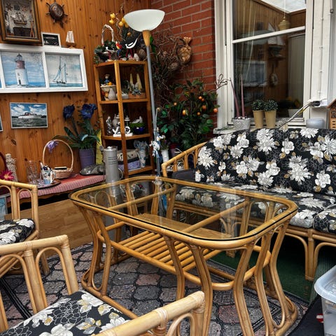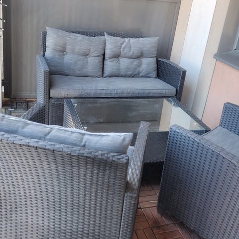 Soffan stod utomhus, ser inga skador men finns rost på metall rammen