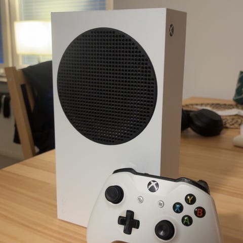 Microsoft Xbox Series X 1 TB spelkonsol i vit färg. Konsolen säljes tillsammans med tre trådlösa Xbox-handkontroller, två vita och en svart. Hdmi och strömmade medföljes.