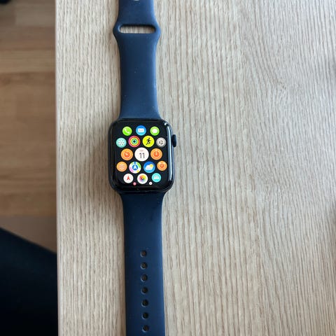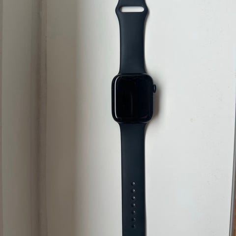 Säljer en Apple Watch Series 7 (45 mm) GPS + Cellular i svart med svart silikonarmband.